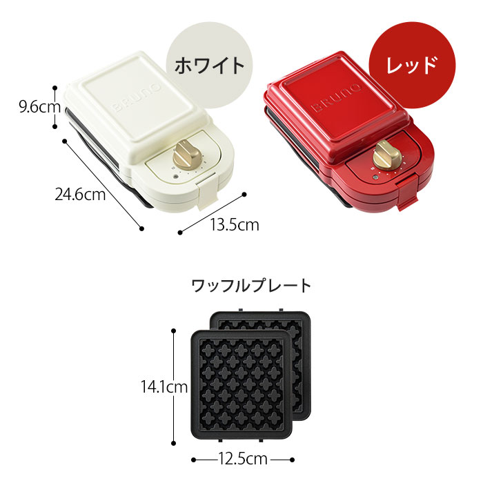 DETAIL COLOR & SIZE サイズ (本体)約 W13.5×H9.6×24.6cm(コード長1.1m) (ワッフルプレート)約 W12.5×H1.1×14.1cm/240g 重量 約 1.3kg(基本プレートを含む) 材質 (本体)フェノール樹脂/スチール (プレート)アルミニウム合金(内面フッ素樹脂塗装) 電源 AC100V 消費電力 550W 機能 タイマー付き、プレート取り外し可 生産国 中国 保証 あり(1年) BRUNO(ブルーノ)シリーズは こちら キッチン家電 ランキング