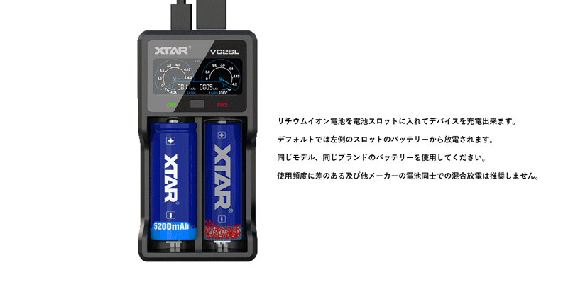 XTAR (エクスター) VC2SL 2スロット リチウム充電器 バッテリーチャージャー 最大2A×1/1A×2 3.6V/3.7Vリチウムイオン電池 10440 18650 26650 1.2V ニッケル水素電池/ニカド電池対応 USB-C 入力 バッテリー活性化機能 電圧 充電容量 充電電流 内部抵抗値 表示機能